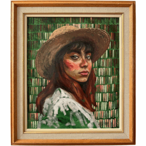 Daphné fait partie de la collection Le Jardin de mes Mémoires. Elle évoque les jardins familiaux, les robes de lin, et ces femmes discrètes mais puissantes qui ont façonné notre histoire. Son regard posé et affirmé, sur fond vert, incarne un moment de calme profond, comme une invitation à se reconnecter à ses racines. Les lignes de fond rappellent les vies uniques des femmes qui nous ont précédées. Daphné est un retour à la terre, à nos mères, à cette transition douce entre l’enfance et l’âge adulte où l’identité prend forme. Sa douceur est une force tranquille, un ancrage dans l’héritage féminin, dans la lenteur et dans la patience. Elle nous rappelle que l’immobilité peut être une puissance en soi.