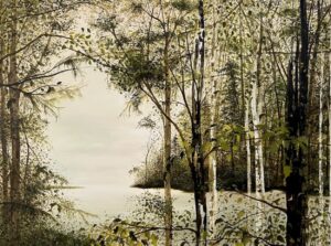 Que dire sur cet immense tableau ? Qu’il me fait du bien. Qu’il est une fenêtre sur la rivière. Que les notes du piano d’Alexandra Stréliski résonnaient en boucle dans l’atelier lorsque je travaillais dessus. Un tronc, une branche, des feuilles. L’étendue. Mon paysage intérieur du moment. Celui de la pianiste et de son concert «Inscape».