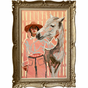 Sutton, c’est une ode tendre et viscérale à cet amour profond qu’on porte parfois à un animal. La jeune femme y enlace son cheval blanc avec la dévotion d’une cowgirl de cœur, fidèle à ses racines sauvages. Le fond rose pastel, strié de lignes jaune beurre, évoque l’enfance, le jeu, les heures passées à rêver de chevaux dans une chambre aux murs tapissés de posters. La douceur des couleurs n’enlève rien à la puissance du lien représenté : il est pur, éternel, indomptable. Dans Sutton, les lignes de fond sont des marqueurs de souvenirs : elles évoquent les passions qui ont forgé l’âme dès le plus jeune âge. L’animal ici est bien plus qu’un compagnon : il est le miroir d’une part de soi qu’on refuse d’abandonner en grandissant. Le cheval blanc symbolise la loyauté, la liberté et les élans de l’enfance qu’on choisit d’honorer au lieu de les enterrer.